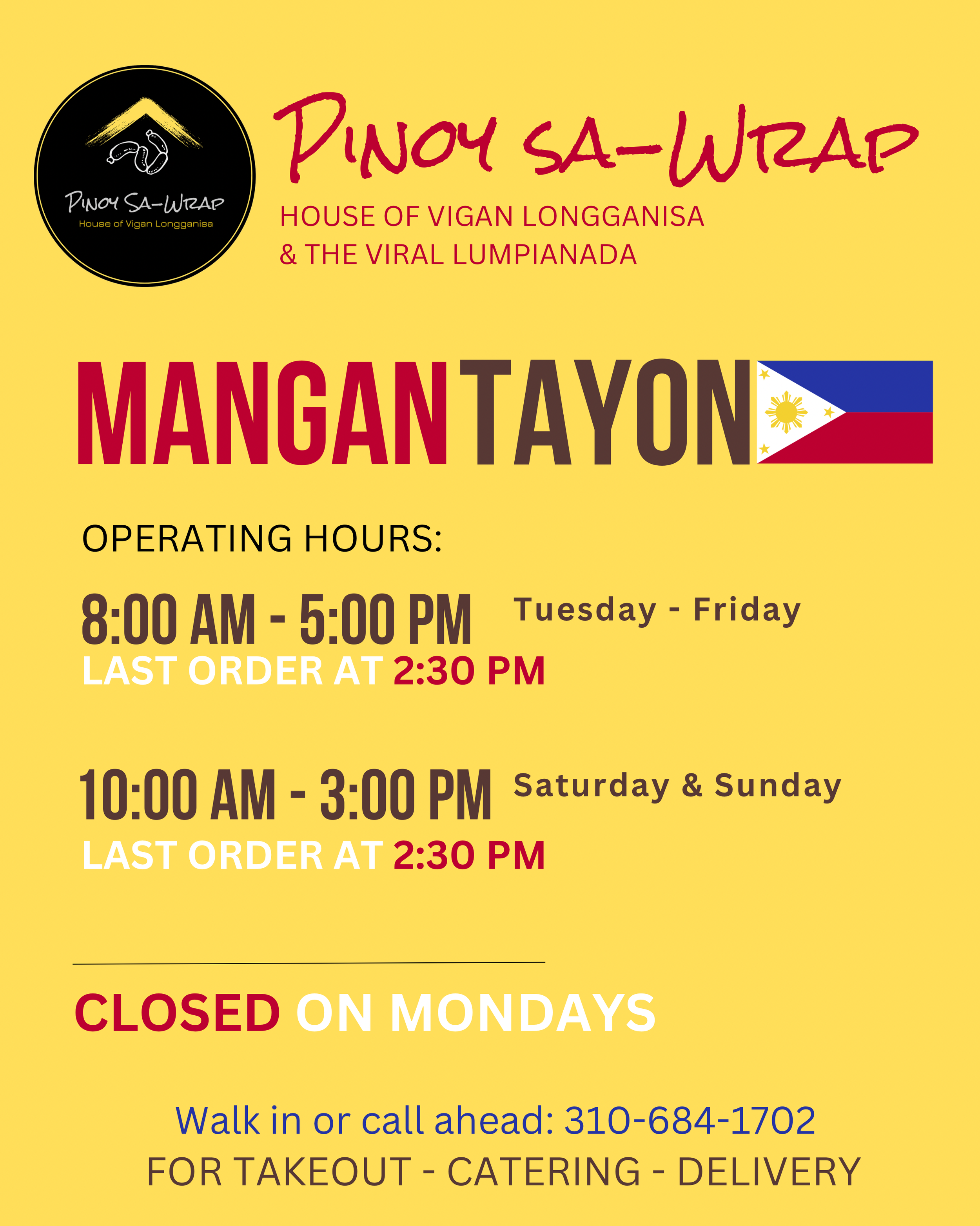 Join our growing family and indulge in the delicious offerings that make us a beloved spot in the community. We can't wait to share our passion for food and culture with you. Gagayyem ken kakabsat, welcome to the PINOY SA-WRAP family!
